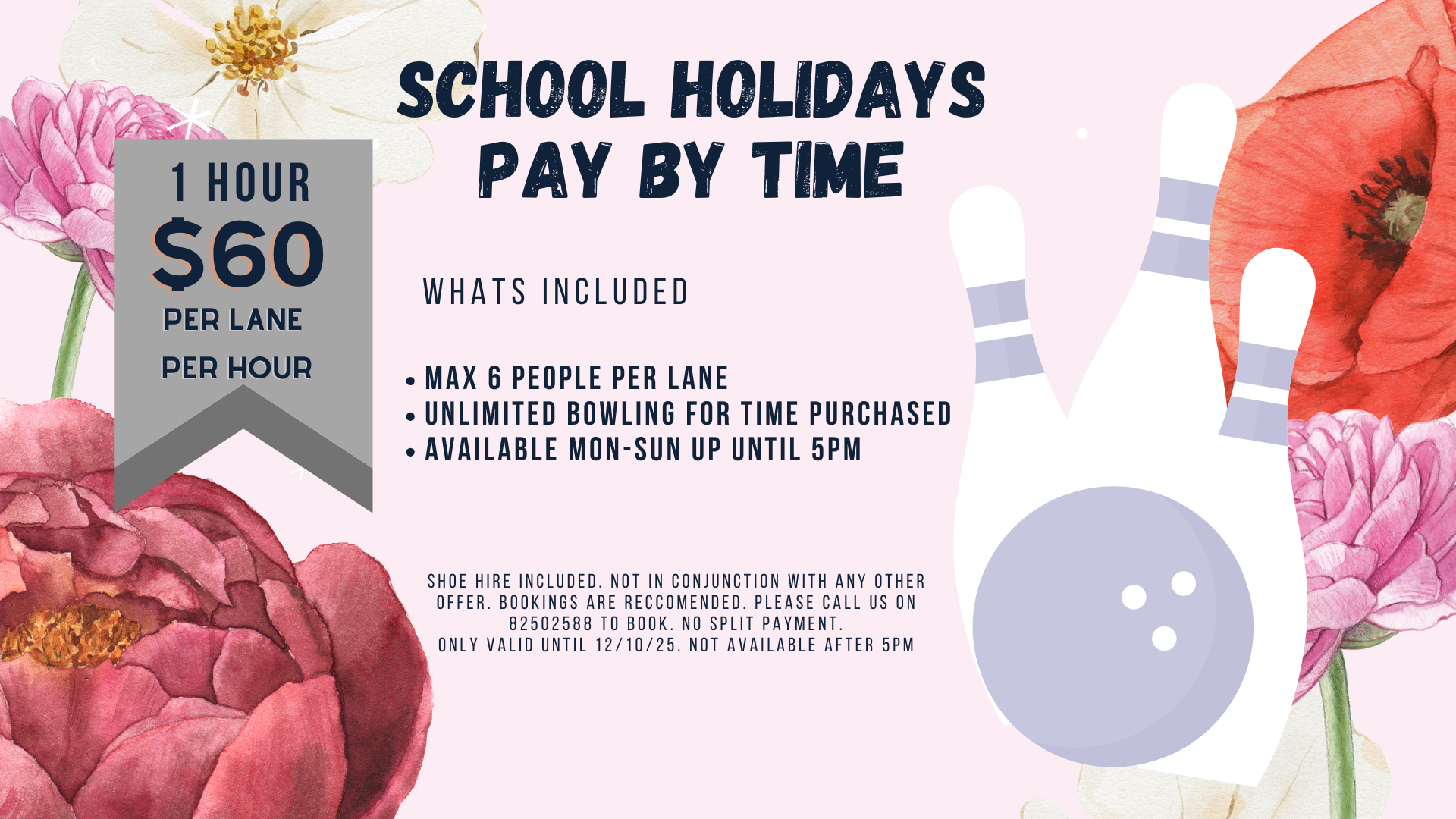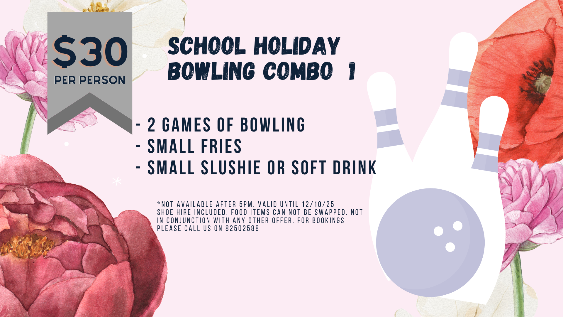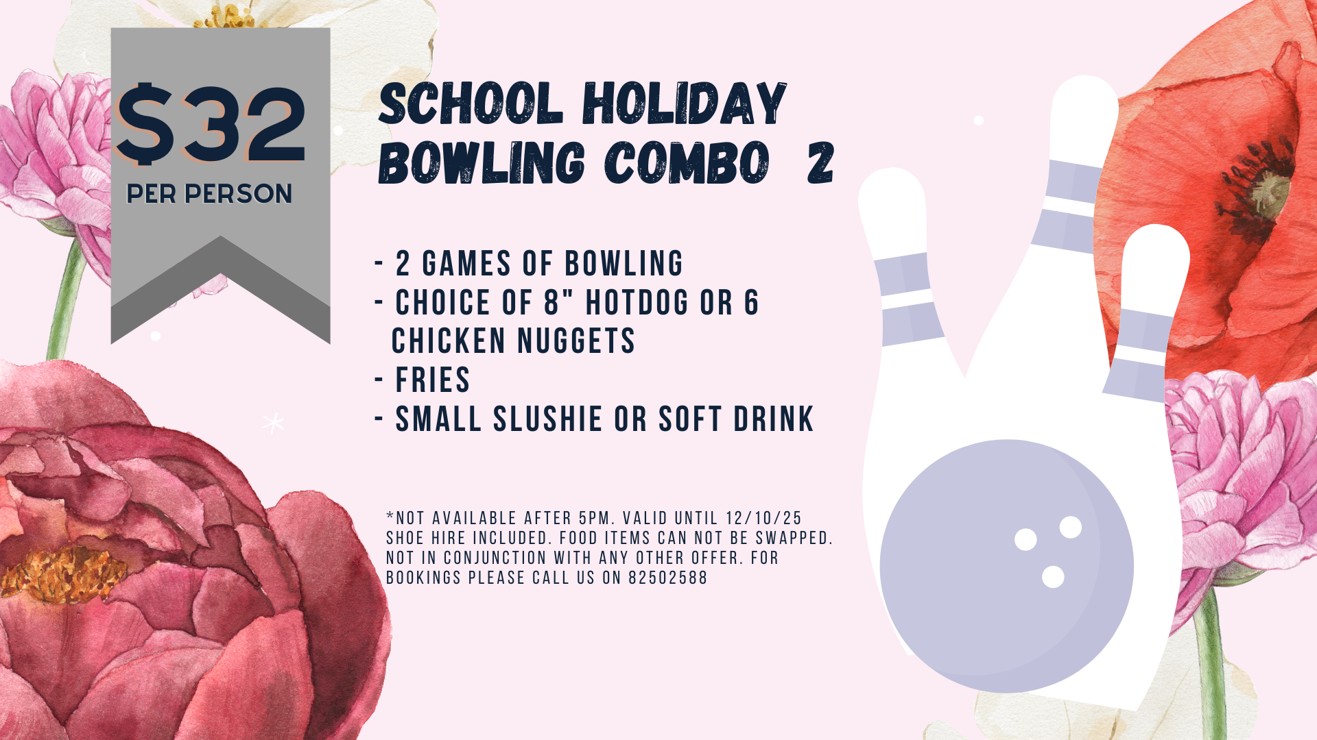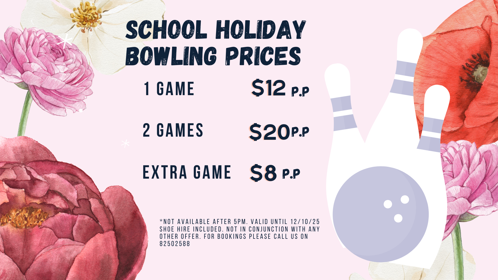 Family Fun Sessions What You Get: – 2hrs of unlimited bowling – shoe hire – glow in the dark bowling – music – minimum 4 to a lane Sessions Saturdays: 4.30pm – 6.30pm Sundays: 11.00am – 1.00pm Price $14.00 per person DOWNLOAD BROCHUREBallistics Sessions What You Get: – 2hrs of unlimited bowling – shoe hire – glow in the dark bowling – music – video clips – minimum 4 to a lane Sessions Fridays & Saturdays: 9.00pm – 11.00pm Price $19.00 per person DOWNLOAD BROCHURESCHOOL HOLIDAY SPECIALS (Valid 27/09/25 - 12/10/25School Holiday Bowling Prices $32 2 Game Combo $30 2 Game Combo $60 per lane 1 Hour Bowling Special Valid 27/09/25 – 12/10/25 only